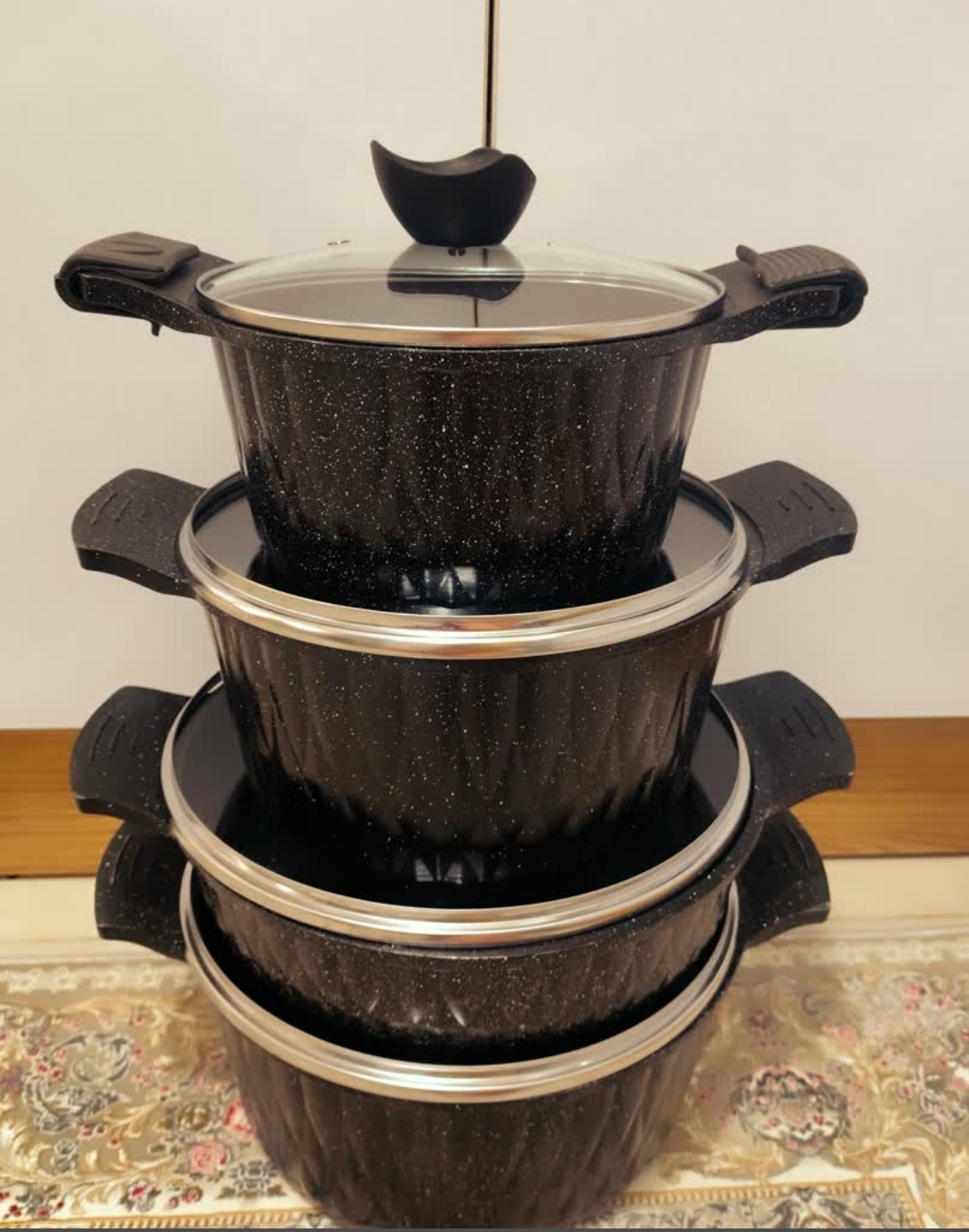 سرویس پخت و پز 10پارچه گلدن لایف جنس:چدن تعداد پارچه:10 پوشش بدنه:گرانیتی پوشش داخلی:گرانیتی سایزبندی قابلمه ها:28و24و20 سایز تابه:28 اقلام اضافه:2 عدد دستگیره سیلیکونی