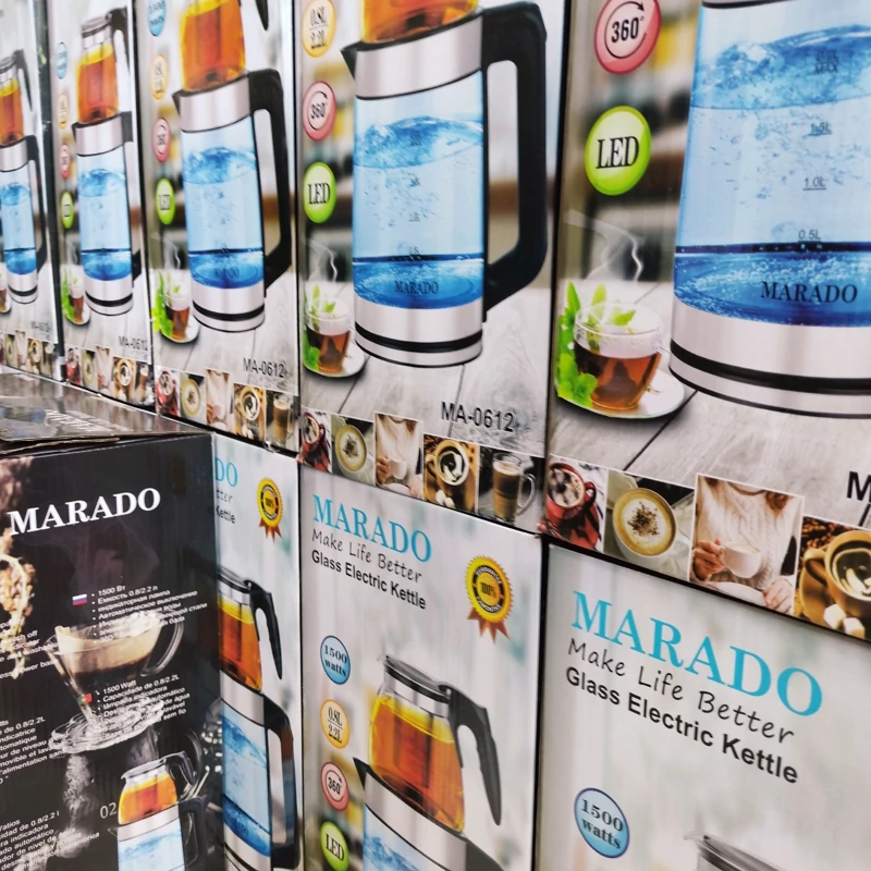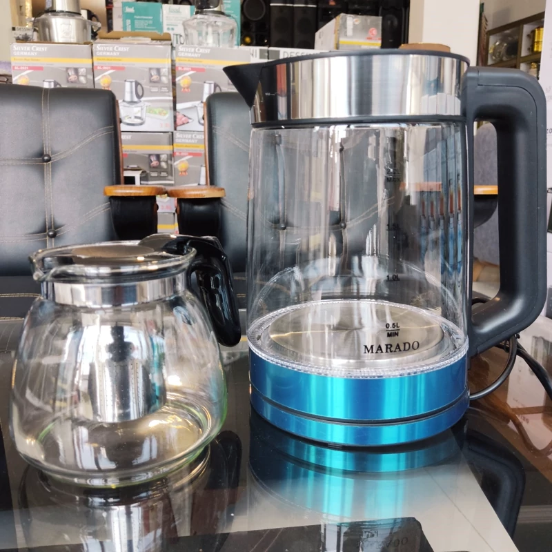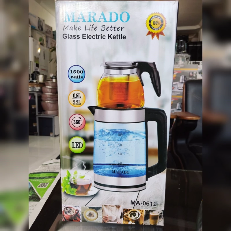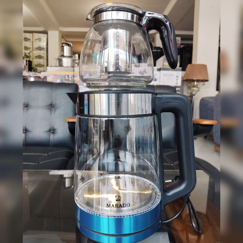 چای ساز روهمی بدنه شیشه ای مارادو چراغ LED دار توان 1500 وات کتری 2,2 لیتـر قوری 0,8 لیتر قابلیت قطع کن اتوماتیک کیفیت عالی