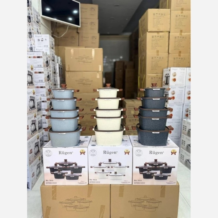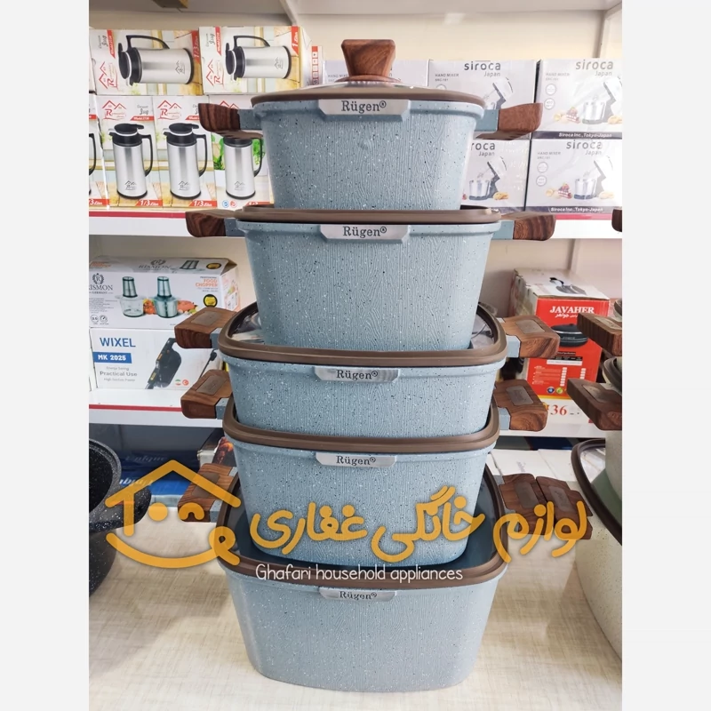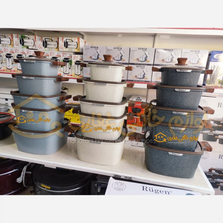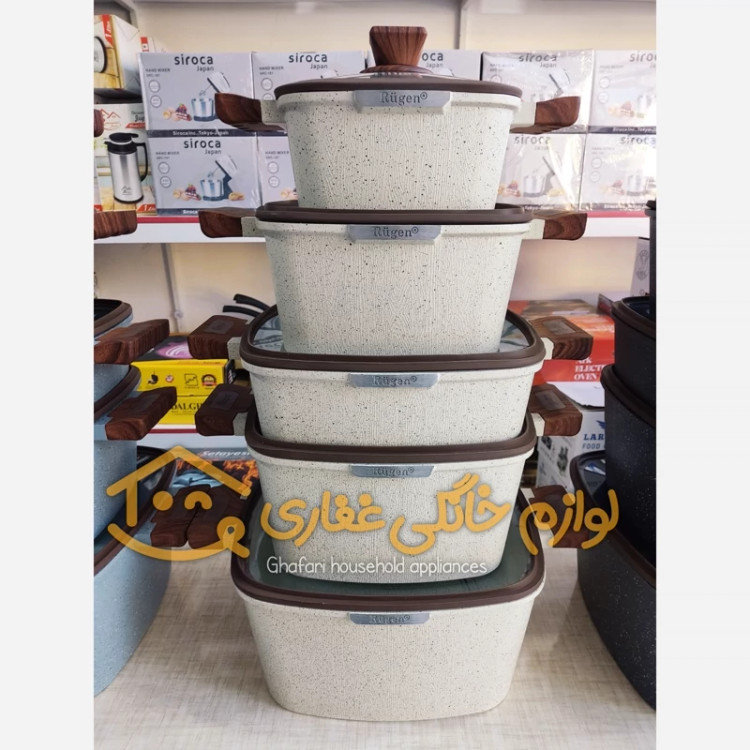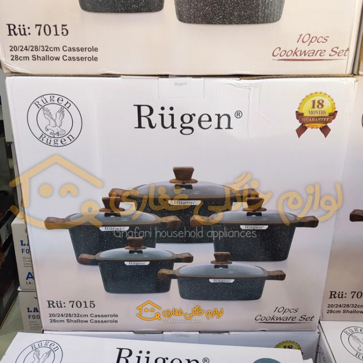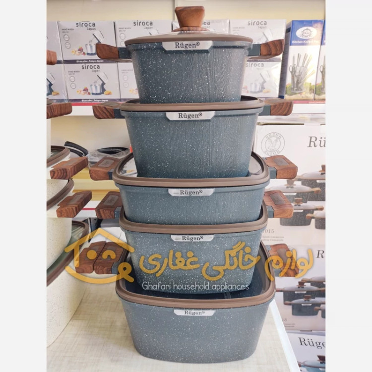 سرویس قابلمه 10 پارچه مربعی روگن مدل Ru-7015، دارای ویژگی هایی است که به اختصار به آن اشاره می کنیم : 4 عدد قابلمه در سایز های 20-24-28-32 1 عدد ماهی تابه 28 سانت جنس بدنه گرانیتی نانو نچسب و ضد خش جنس دسته ها پلاستیک فشرده با روکش مخملی جنس درب پیرکس تمام شیشه ای با لبه های سلیکونی کفی چند لایه چدنی با شعله پخش کن مناسب اجاق برقی و گاز بدنه محافظت شده با گرانیت نانو تضمین ثبات رنگ در طولانی مدت دسته های عایق حرارت درب پیرکس مقاوم در برابر شک حرارتی و ضربات ساخت شرکت روگن آلمان