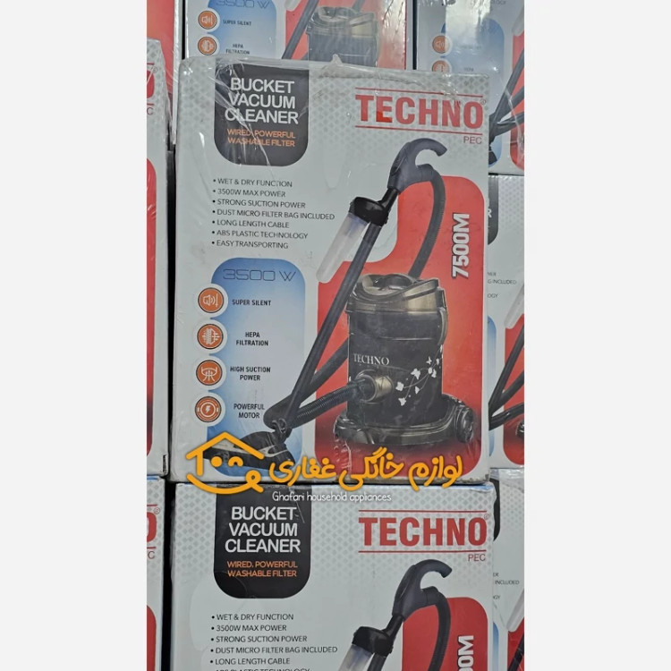 جاروبرقی سطلی چرخ دار تکنو مدل7500M مکش فوق العاده قوی با قدرت 3500وات موتور قوی و هواکش دار که باعث میشه تو استفاده بلند مدت گرم نکنه سیم پیچی تمام مسی کم صدا،دارای دوکیسه، تعداد بالا(فروش بصورت تکی و عمده) این مدل آب کشی نداره و فقط مناسب خاک هستش)