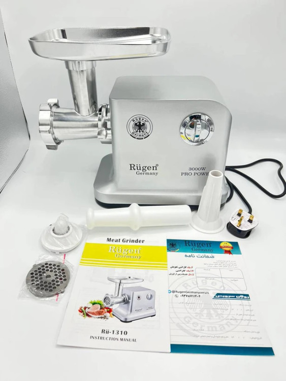 چرخ گوشت روگن مدل RU-1310 یکی از وسایل آشپزخانه است که برای چرخ کردن و خرد کردن انواع گوشت قرمز و برای درست کردن غذا های مختلف مانند کوفته، برگر، سوسیس خانگی، کالباس و همچنین با استفاده از چرخ گوشت روگن مدل RU-1310 می توانید انواع سبزی جات، حبوبات، گوشت مرغ، مغزی جات و سیب زمینی را خرد کنید. برای چرخ گوشت روگن مدل RU-1310 امکانات بی نظیری در نظر گرفته شده است. در همین راستا شرکت روگن این محصول خود را با فناوری ها و قابلیت های بی نظیری تولید می کند که تا حدود زیادی این چرخ گوشت را به یک دستگاه صنعتی اما در قالبی کوچک تر تبدیل کرده است، که برای مثال می توان به طراحی بسیار زیبای آن در کنار گیربکس فلزی به همراه تیغه های فولادی و گلویی بزرگ اشاره کنیم. این چرخ گوشت حرفه ای از بدنه ای تیتانیومی به رنگ نقره ای بهره می برد که بر روی آن یک پنل آنالوگ و عقربه ای تعبیه شده است و به کمک آن می توانید دستگاه را روشن و خاموش کنید و یا سرعت آن را کم و زیاد کنید . بدنه ی چرخ گوشت روگن مدل RU-1310 از جنس تیتانیوم ریخته گری می باشد که قوی تر و سبک تر از استیل است.