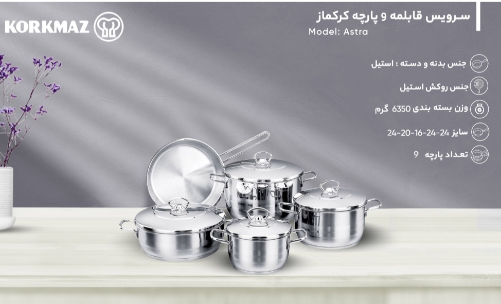 یک قابلمه سایز 24 به همراه در استیل یک قابلمه سایز 20 به همراه در استیل یک قابلمه سایز 16 به همراه در استیل یک تابه گرد دو دسته سایز 24 به همراه در استیل یک تابه گرد تک دسته سایز 24 بدون در